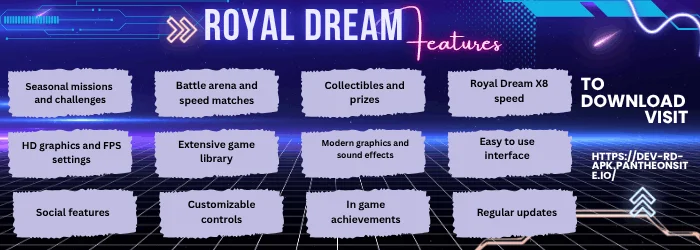 Royal Dream APK memiliki berbagai fitur, beberapa di antaranya adalah berbagai mode permainan, navigasi yang mudah, performa permainan yang baik, dan hadiah dalam game yang akan memberikan pengalaman bermain yang lebih baik. Fitur lainnya adalah akses cepat ke berbagai mini-game dari satu aplikasi. Pengembang memperbarui game ini secara berkala.