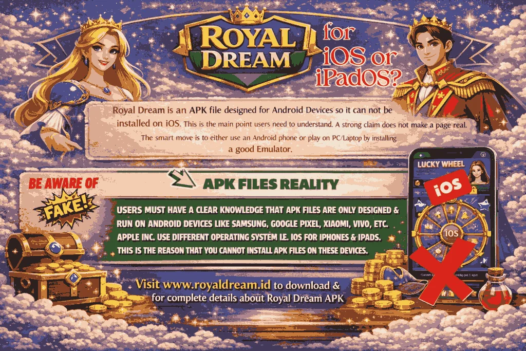 Banyak orang mencari “Royal Dream untuk iPhone” berdasarkan seberapa baik versi APK Android dari aplikasi tersebut berfungsi di ponsel Android mereka. Orang-orang menginginkan hal yang sama terjadi di iPhone dan iPad mereka. Ini adalah poin utama yang tidak boleh dilewatkan. Poin utamanya adalah Anda tidak dapat menginstal versi APK Android di perangkat iOS.