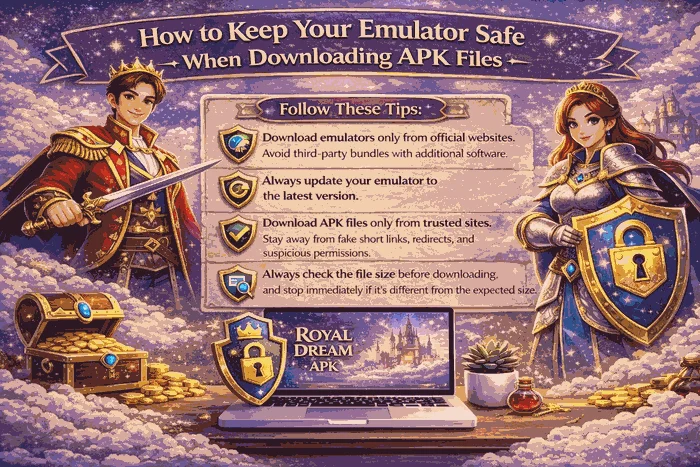 Bahkan sebelum mengunduh Royal Dream, langkah terpenting adalah menginstal emulator yang tepat dan aman. Selalu unduh emulator hanya dari situs web resmi dan hindari paket pihak ketiga yang mengemas ulang emulator dengan perangkat lunak tambahan. Selalu perbarui emulator Anda ke versi terbaru, karena alat pembaruan resmi adalah yang paling aman untuk perbaikan bug, optimasi kecepatan dan stabilitas.
